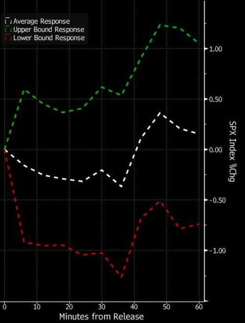 Speaking of the Powell presser, Bloomberg’s Mark Cudmore notes that “in the past 12 months, equities have typically reacted positively to the FOMC statement, or rather, not the statement itself, but Jerome Powell’s uncanny ability to soothe the market at the post-meeting press conference. You can see the effect very clearly in this graphic of the S&P 500 in the hour following the release of the communique.”