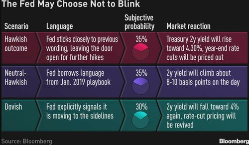 Next, turning to the Powell presser, Goldman notes that while the press conference is always worth listening to, it will be virtually impossible for Powell to credibly walk back a dovish message in the statement, if the Fed has signaled being on hold don’t think there will be much he can say to convince the market otherwise…on the other hand if the statement leans hawkish he probably can sound dovish in the presser (he has had a tendency to do so lately).