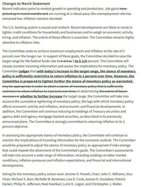 While we previously did a lengthy preview of what to expect from today’s “Final rate hike and pause” Fed meeting, due to the significance of today’s meeting we wanted to summarize the key points.