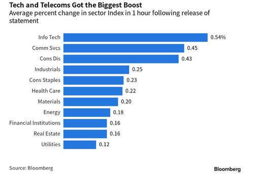 Drilling down, here’s what the average response looks like broken down by sector. While all gained, the more rate-sensitive tech sector gained the most.