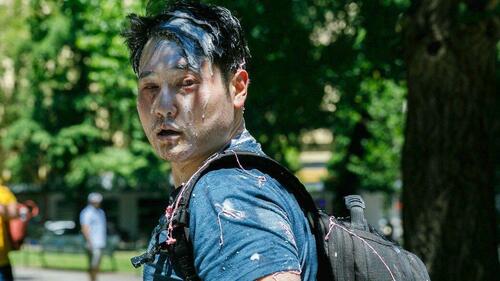 Andy Ngo, a Portland-based journalist, is seen covered in an unknown substance after unidentified Rose City Antifa members attacked him in Portland, Ore. on June 29, 2019. (Moriah Ratner/Getty Images)