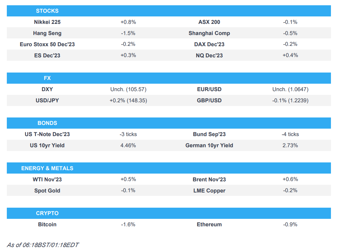 - US stocks finished with marginal losses on Friday on what was a choppy session following mixed PMI data in which Manufacturing PMI topped forecasts but remained in contraction territory and Services PMI disappointed, while there were several central bank speakers including Fed’s Bowman who implied she was the top dot at the Fed saying more rate hikes are likely needed.
