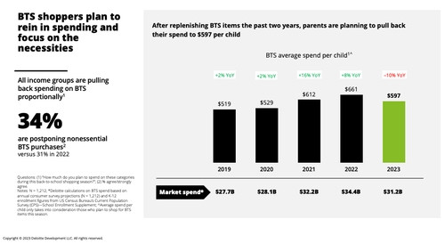 Parents across three income groups are expected to reduce BTS spending by 10% year-over-year, with average spending per child sliding to $597. The overall BTS market will likely contract for the first time in nine years to $31.2 billion, compared with $34.4 billion in 2022.