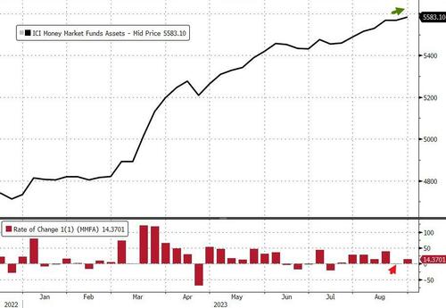 After last week’s brief (and small) dip, US money-market funds saw inflows once again last week, adding $14.4BN to reach a new record high of $5.5TN…