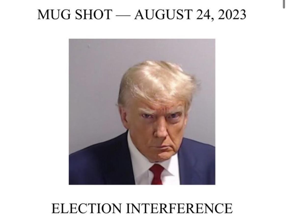 Trump tweeted his mugshot with a caption that read: “ELECTION INTERFERENCE – NEVER SURRENDER! – DONALDTRUMP.COM”