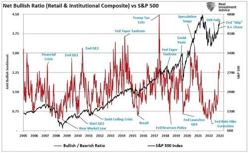 However, it isn’t just professional managers piling into the equity market but retail investors also. In 2022, retail investor sentiment also hit extremely bearish levels. As retail investors capitulated and repurchased equities, the market surged higher, rapidly increasing their bullish sentiment.