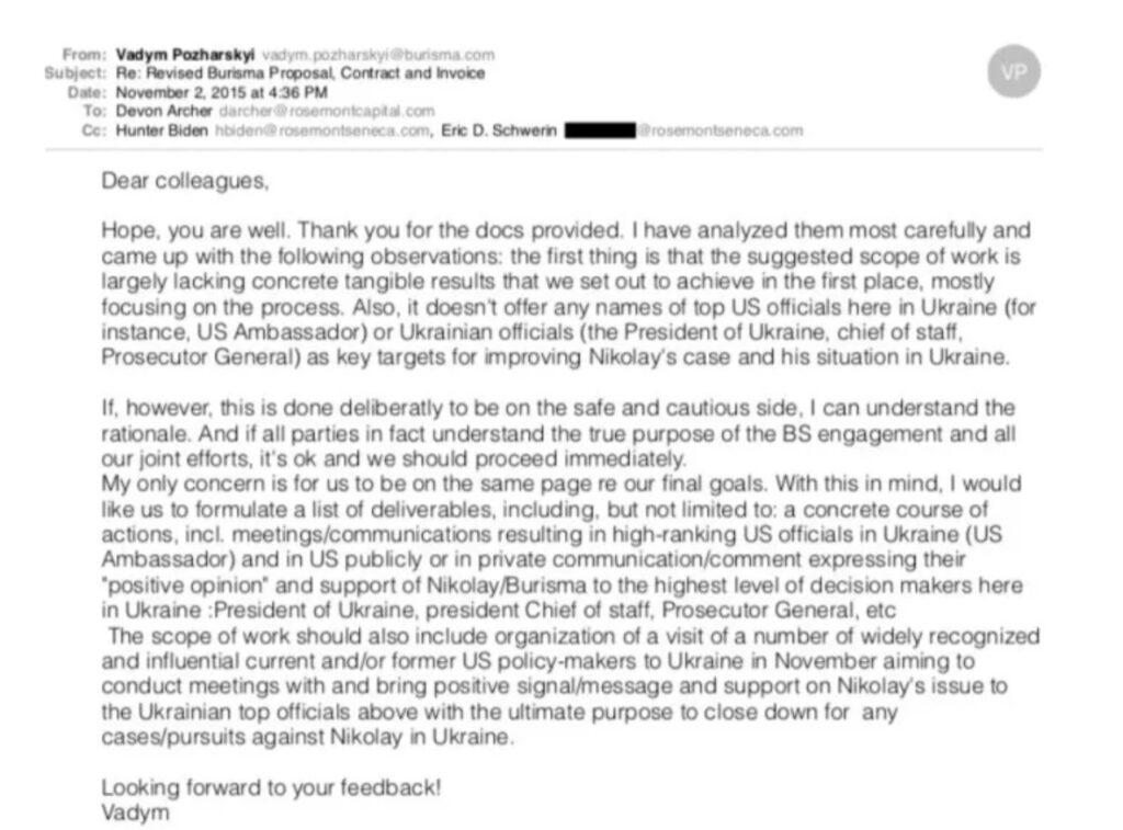 On November 2, 2015, one month before Joe Biden visited Ukraine, Hunter Biden received an email from Vadym Pozharskyi, a Burisma executive, about his “ultimate purpose” of working with Hunter Biden and his associates, Eric Schwerin and Devon Archer, a fellow Burisma board member.