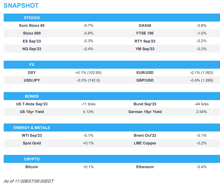 - APAC stocks mostly followed suit to the weakness in global peers including on Wall St where stocks and bonds were pressured by the US rating downgrade, AMD earnings and hot ADP data, albeit with some of the losses were stemmed in Asia as participants digested Chinese Caixin Services and Composite PMI figures.