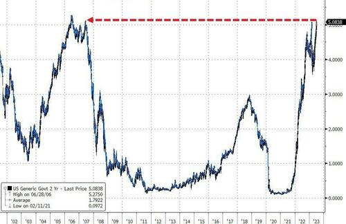 Until today’s mini rout, traders were starting to wonder if anything they learned in Finance 101 even mattered anymore: after all, one of the core tenets of modern finance and monetary theory is that higher rates make (unprofitable) tech stocks less valuable due to the higher discount factor that one must apply on their (eventual) future cash flows as well as the terminal value (if any). And yet, with 2Y yields higher rising to the highest level since June 2007, the recent surge in non-profitable tech companies is quite  eyebrow raising.