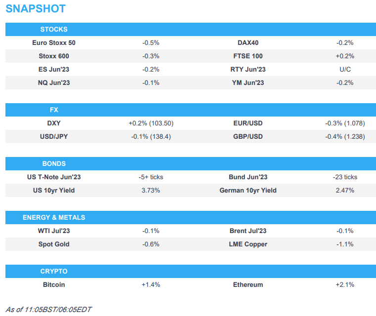 - European bourses are pressured, Euro Stoxx 50 -0.5%, with the exception of the FTSE 100 +0.1% which is deriving some support from regional banking names on post-PMI hawkish BoE implications.