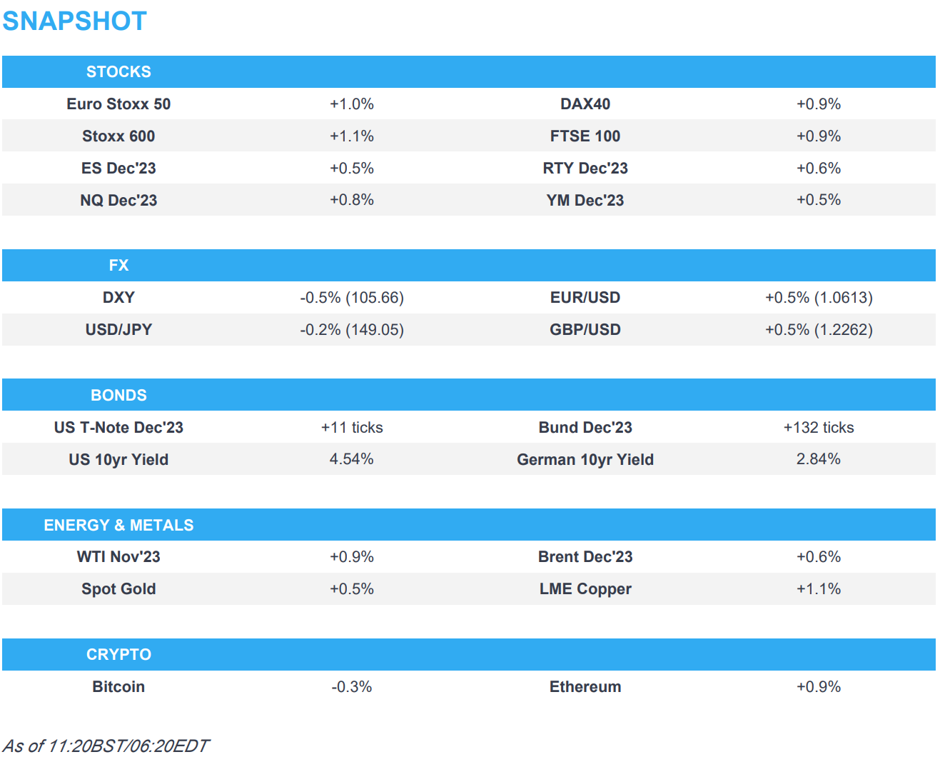 - European bourses are trading higher across the board with the Stoxx 600; US equity futures are also firmer in a continuation of yesterday’s gains.