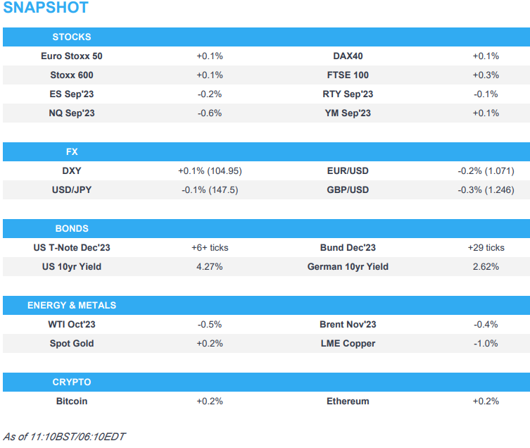- Stateside, futures remain in the red but as above are off lows. NQ lags given marked AAPL pressure in the pre-market