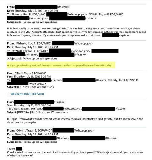 This is the subtext of the “F-bomb” sequence. The POTUS Instagram account was experiencing slow growth. Administration officials wrote demanding to know why. They were told that “from what we understand it was a technical issue that we can’t get into but it’s now resolved.” At this point Flaherty wrote the “Are you fucking serious?” email, which led to a response from Facebook that the problem was a “bug in our recommendation surface.” Further queries led to a Facebook official whose name has been redacted writing to explain.
