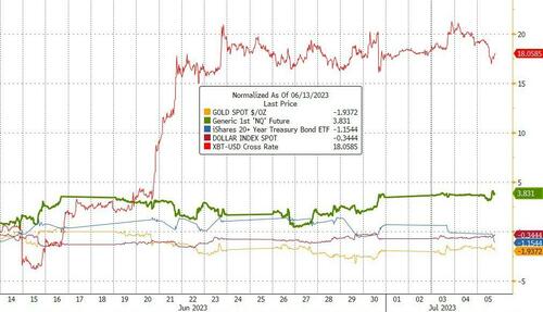Since the last FOMC meeting on June 14th – when The Fed ‘paused’ its hiking cycle (but pressed its view, via The Dots, that the cycle has at least 2 more hikes in it) – gold and bond (prices) are down 1-2% with the dollar basically flat. Stocks have rallied notably, but crypto has been the big winner…