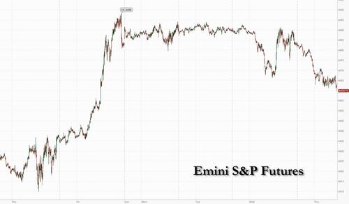 US futures extended losses as markets finally noticed the recent surge in Treasury yields across the globe, sparking fears of stagflation and following recent remarks from the Federal Reserve that were more hawkish than anticipated. Sentiment was also cautious ahead of fresh employment data. Stocks have struggled as a result, with the Stoxx 600 down 1.2% and on course for its largest fall in six weeks. As of 8:00am, ET, S&P 500 and Nasdaq 100 futures lose 0.6%. Treasury yields rose across the curve, adding to gains on Wednesday spurred by the Fed minutes. The policy sensitive two-year rate inched up to 4.96%. The dollar initially dropped but then spiked after a blow out ADP report.