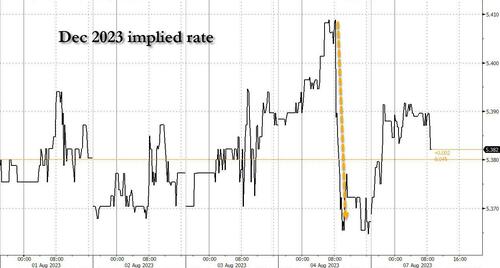 Bond market jubilation wasn’t completely contained to the long end. There wasn’t much movement in the implied probability of a further rate hike in the Fed Funds futures, but the implied rate as at December next year fell by about 10bps. The bond market seems to be suggesting that the jobs figures point to a faster economic slowdown and more active easing cycle from the Fed in an attempt to pilot the economy into a beautiful soft landing, rather than ending up as a dark smudge on the tarmac.