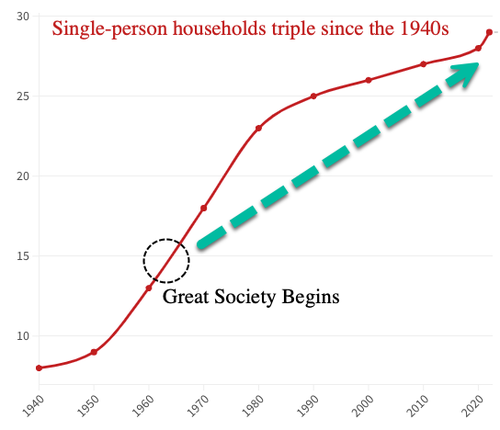 Census data shows 27.6% of all US-occupied households were one-person households in 2020, up from just 7.7% in 1940. The largest share of people living alone occurred between 1970 and 1980, when the percentage increased from 17.6% to 22.7%, right after the welfare programs started.