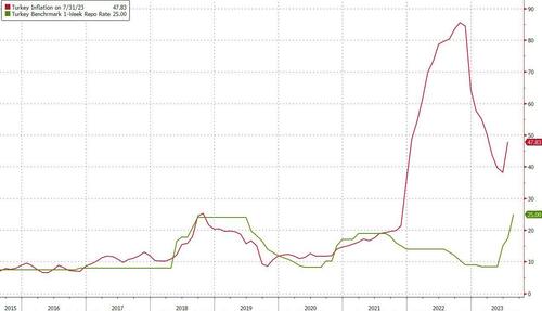 The Turkish lira, which until today was the worst performing currency of 2023, exploded higher amid a massive short squeeze, after the Turkish central bank unexpectedly raised its benchmark interest rate much more than expected, in the first sign that a new lineup of monetary officials favors more aggressive moves to curb inflation running near 50%, and a stern rebuke to Erdogan’s long-running bizarro conviction that Turkey will keep rates lower in a bid to contain inflation (also known as Erdoganomics).