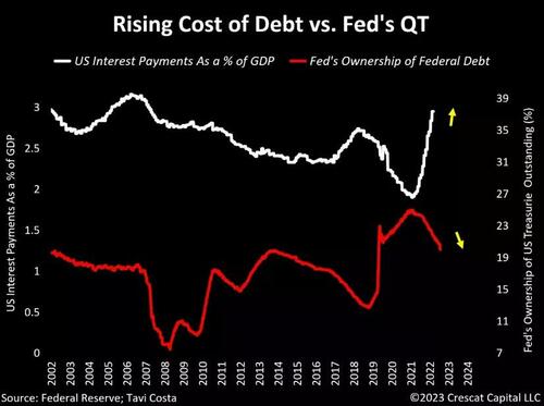 The US is currently operating as if it were facing another pandemic lockdown from a fiscal spending and debt issuance perspective, yet there is one critical difference. Rather than the Fed financing over 50% of newly issued Treasuries, they are shrinking their balance sheet assets at the fastest pace in history.