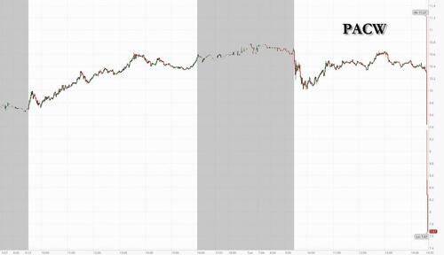 Troubled regional bank PacWest Bancorp saw its stock move wildly moments ago, first spiking then tumbling, after the WSJ reported that the far smaller Banc of California (market cap of $770MM vs PACW’s $1.2BN) was in advanced talks to buy PacWest Bancorp PAC, in what appears to be the first aggressive post-crisis bank “take-under” as the lenders seek “to further shore themselves up following a regional-banking crisis earlier this year.”