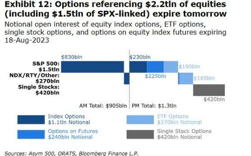 Today’s option expiration comes at the end of the worst week for US equities since the collapse of SVB triggered a mini-crisis. According to former Goldman options guru Rocky Fishman, founder of derivatives analytical firm Asym 500, some $2.2 trillion of longer-dated contracts tied to stocks and indexes are scheduled to expire today.