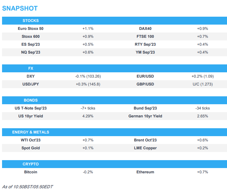 • Stateside, futures were initially around the unchanged mark but have picked up in tandem with the above action with specifics light as we look towards the Jackson Hole symposium, ES +0.5%.