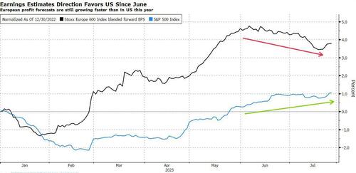 About halfway through this term’s report card, earnings for the MSCI Europe are down by almost 12% on a year earlier, according to data compiled by Bloomberg Intelligence. That’s the first drop since 2020. Over in the US, companies are presenting the most earnings beats in two years.