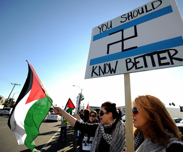 Anti-Israel protesters on Thursday threw smoke bombs and poured red paint on the sidewalk in front of the home of the president of a prominent Jewish group.