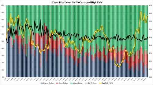 After a stellar 3Y auction yesterday, today – just hours after the clearly dovish CPI print sent yields tumbling – we got a sale of $32BN in benchmark 10Y paper. Perhaps because of the sharp spike in prices and lack of concessions, the auction was not as strong as it could have been but it was still rather impressive.