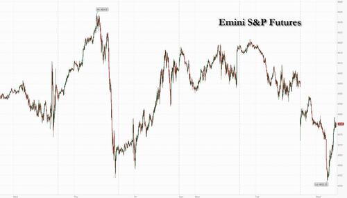 US futures slumped as part of a global risk-off tone (but were well off their lows, which were down as much as 1%), after the US was stripped of its AAA top-tier credit rating by Fitch (which joined S&P in doing so back in 2011), due to growing fiscal deficits and an “erosion of governance” even as Treasuries yields and the Dollar were steady. And in a complete coincidence, at the exact same time, Donald Trump was indicted for a record third time on federal charges over his efforts to overturn the 2020 presidential election, and has a court date set for Thursday.