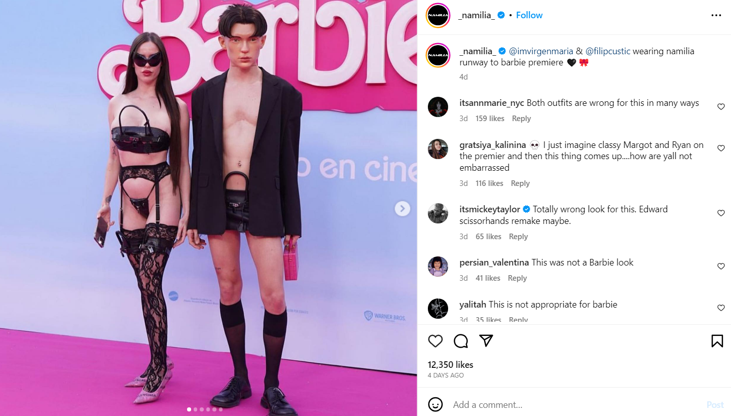 “Influencers” wearing Namilia at the Barbie premier. Most people in the comments found that they did not belong there. But Namilia and Barbie are all part of the same globalist agenda so, in actuality, they do belong there.
