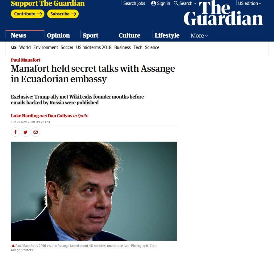 The appalling lie, which the Guardian’s $700,000 a year editor has refused to retract or remove, despite criticism even from the Washington Post which named Villavicencio as the fabricator, was aimed to give support to Clinton’s flagging “Russiagate” invention, which was crumbling fast.